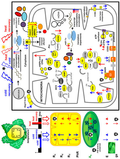 Proposed model of the impact of temperature stress and recovery on mitochondrial biogenesis in cauliflower curds. Investigated phenomena are depicted. Regulations in the cold and heat are shown by thin blue and red arrows; regulations in stress recovery by the respective thick blue and red arrows. Up-regulations and down-regulations are denoted by arrow heads raised up and down, respectively. Icons with a shield inside depict sustained physiological parameters or phenomena (left panel) or protective function of selected proteins in mitochondrial biogenesis (right panel). Left panel: stress dosage scheme and regulations in key physiological parameters. Right panel: Proteins and complex subunits regulated by abundance are yellow-marked. Some regulatory steps affected by stress conditions are highlighted by discontinuous lines and arrows. Important abbreviations: A, net photosynthetic rate; ATP1, ATPQ, ATP synthase subunits 1 and d; CCM, cytochrome c maturation; CPN, chaperonin; C(s), complex(es); COX, cytochrome c oxidase; CS, citrate synthase; cyt. c, cytochrome c; E, leaf transpiration; GCS, glycine cleavage system; GDC, glycine decarboxylase; gs, stomatal conductance; HSP(s), heat shock protein(s); IDH, isocitrate dehydrogenase; MDH, malate dehydrogenase; MPP, mitochondrial processing peptidase; mt, mitochondrial; NAD9, complex I subunit 9; P5CDH, 1-Δ-pyrroline-5-carboxylate dehydrogenase; PDH, pyruvate dehydrogenase; 3-PGDH, 3-phosphoglycerate dehydrogenase; PGK1, phosphoglycerate kinase isoform 1; PhR, photorespiration; ProDH(s), proline dehydrogenase(s); Rd, light respiration; Rn, dark respiration; RT, total light respiration; SCL, succinyl-CoA ligase; SHMT, serine hydroxymethyltransferase; TCA, tricarboxylic acid; VDAC, voltage-dependent anion channel. Further data in the text.