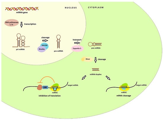 miRNA biogenesis starts in the nucleus (Figure 1) with the transcription of the miRNA genes by the RNA polymerase II (or RNA polymerase I in some human miRNAs). It results in the formation of hairpin loop primary transcript known as pri-miRNA, of over several kilobases long, which contains both a 5′ cap and a poly(A) tail. Nuclear protein DGCR8 recognizes double-stranded pri-miRNA structures. The DGCR8 is associated with the Drosha, RNA-specific nuclease. Together they form a microprocessor complex that take part in the processing of primary miRNA transcripts in the nucleus. DGCR8 in this complex attaches to the single stranded pri-miRNA ends and directs the catalytic ribonuclease domain so that it is cleaved releasing the miRNA precursor (pre-miRNA) hairpin structures of 60–100 nucleotides [,]. In this form, they are transferred to the cytoplasm by the transport proteins Exportin 5 (Exp-5). In the cytoplasm the Dicer endonuclease allows the formation of a miRNA duplex of approximately 22 nucleotides. One of the strands of the duplex (called the passenger strand or miR*) is discarded, second strand (called the guide strand, leading strand or miR) is connected to the RISC (RNA-induced silencing complex). The basic components of the RISC loading complex are Dicer, Ago2, PACT, and TRBP, among which the Ago2 protein has endonuclease activity. RISCs associated with miRNAs are designated miRNA containing ribonucleoprotein complex (miRISC or miRNP) [,,]. This complex is directed by miRNA to the target mRNA. Crucial for target recognition is the seed region (sequence spanning from position 2 to 8 at the 5′ end) of the miRNA guide which target mRNA hybridizes through complementarity of the bases. The effect of this combination can be twofold: cleavage of target mRNA with subsequent degradation or translation inhibition and it is dependent on the degree of match between the miRNA and its target mRNA [,]. In the first case, the specific miRNA binds to cellular mRNAs containing sequences that are completely or almost completely complementary. The target mRNA is cleaved in the middle of the hybridizing sequence, while the miRNA itself remains unchanged and may re-participate in mRNA recognition and degradation. The level of the specified transcript and the synthesis of the protein that it encodes are lowered. This mechanism is commonplace in the world of plants [,].