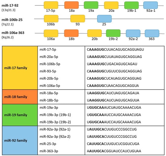 The miR-106b-25 cluster is located on chromosome 7 within the intron 13 region of the MCM7 gene. The miR-106b-25 cluster encodes miR-106b, miR-93, and miR-25. The miR-106a-363 cluster is located on the X chromosome and contains six miRNAs: miR-106a; miR-18b; miR-19b-2; miR-20b; miR-92a-2; and miR-363 []. Reconstruction of the evolutionary history of the miR-17-92 complex and its paralogs demonstrated that they originate from tandem genetic duplication of individual members of clusters, followed by duplications of entire clusters and next loss of individual miRNAs [,]. Based on the sequence homology and seed conservation the miRNAs can be grouped into four miRNA families: the miR-17 family (miR-17-5p, miR-20a, miR-20b, miR-106a, miR-106b, miR-93); the miR-18 family (miR-18a, miR-18b); the miR-19 family (miR-19a, miR-19b-1 and miR-19b-2); and miR-92 family (miR-92a-1, miR-92a-2, miR-25, miR-363). The miR-17-92, miR-106b-25, and miR-106a-363 clusters act as oncogenes [,]. Their expression promotes cell proliferation, induces tumor angiogenesis, and suppresses apoptosis of cancer cells [].