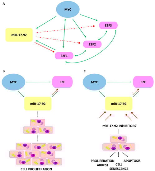 The interaction between MYC/E2F/miR-17-92 and its effect on the cancer cells. Green arrows indicate a transcriptional induction. Bidirectional arrows refer to mutual transcriptional induction. Red lines indicate translational inhibition, dashed lines indicate weaker inhibition. (A) The interactions among MYC, E2F1, E2F2, and E2F3 transcription factors and the miRNAs of the miR-17-92 cluster; (B) Elevated levels of miR-17-92 cluster cause disruption in homeostasis leading to a decrease in apoptotic ability and increasing the proliferation of tumor cells; (C) Inhibition of miR-17-92 activity stop excessive proliferation, restoring the process of cell aging and apoptosis.