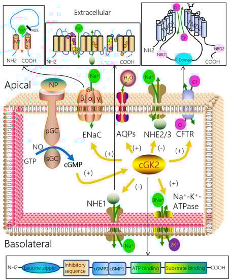 Regulation of fluid and salt transport by the cGK2 signal pathway in epithelial cells. Abbreviations: NP, natriuretic peptide; NO, nitric oxide; pGC, particulate guanylyl cyclase; sGC, soluble guanylyl cyclase; cGMP, cyclic guanosine monophosphates; GTP, guanosinetriphosphate; cGK2, cGMP-dependent protein kinase isoform 2; ENaC, epithelial sodium channel; M1 and M2, helical transmembrane domains; ABS, amiloride binding site; AQPs, aquaporins; CFTR, cystic fibrosis transmembrane conductance regulator; TMD1 and TMD2, transmembrane-spanning domains; NBD1 and NBD2, nucleotide-binding domains; R domain, regulatory domain; Na+-K+-ATPase, sodium potassium adenosine triphosphatase; NHE, Na+/H+ exchanger; pink circles, ion transport and inhibitor binding sites; orange circles, ion transport and binding sites; yellow circles, inhibitor binding sites; green arrows, direcction of transport; oriange arrows, direction of regulation; blue arrow, direction of reaction process; black arrows, direction of enlarged viewing.
