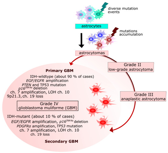 Primary and secondary glioblastoma multiforme (GBM)—origin and genetic changes. EGF/EGFR, epidermal growth factor/receptor; MDM2, mouse double minute 2 homolog; CDKN2A, cyclin dependent kinase inhibitor 2A; RB, retinoblastoma; TP53, tumor protein p53; PTEN, phosphatase and tensin homolog; NF1, neurofibromin 1; PDGFRα, platelet derived growth factor receptor alpha; IDH1/2, isocitrate dehydrogenase (NADP(+)) 1, cytosolic/2, mitochondrial; LOH, loss of heterozygosity; ch., chromosome(s).