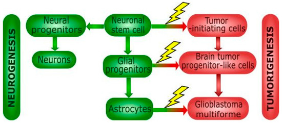 Differentiation of neural stem cells and cancer transformation. Neuronal stem cells can produce normal (green blocks) or cancer (red blocks) cells of various potential. Mutations occurring during differentiation of neural stem cell (NSCs) can contribute to tumor formation. NSCs can differentiate into neural/glial progenitor cell, but their transformation can lead to the formation of tumor-initiating cells (TICs). Neural progenitors undergo differentiation into neuronal cells, but glial progenitors differentiate into astrocytes. Genetic aberrations in glial progenitor cell can lead to tumor progenitor stem-like cells, but oligodendrocytes and astrocytes are also potential candidates involved in glioblastoma formation. TICs are also committed to the tumor formation via its differentiation into brain tumor progenitor-like cells.