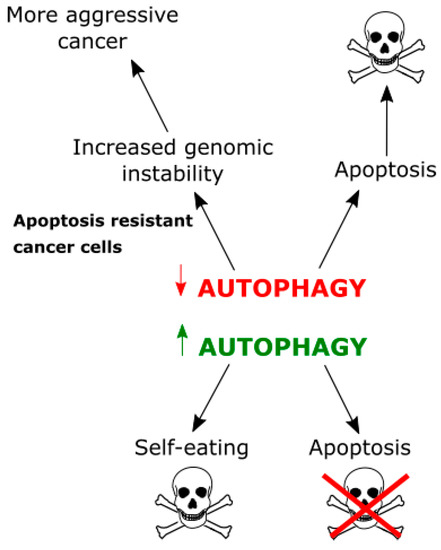 Cellular senescence is associated with the production of usually harmful cellular species, which can be cleared by autophagy, a process of removal of damaged or no longer needed cellular products [6]. In general, autophagy can help a cell to cope with many kinds of stress and cancer cells can use it to promote their intensive proliferation when their access to nutritional compounds is limited and to survive some therapies [7,8,9,10]. However, massive autophagy, which can lead to destructive cell “self-eating”, can induce apoptosis as suggested by the studies in which inhibition of autophagy decreased apoptosis [11]. “Autophagic cell death” is a term related to cellular death resulting from autophagy inhibition [12]. However, there are some open questions concerning autonomy of autophagic death effect [13]. Autophagic vehicles are present in many dying cells, which misleads to the conclusion that autophagy is a mediator of cell death. In fact, autophagic vacualization can help a cell survive against stress eventually causing its death. Despite many disputable and even conflicting results, autophagy may be important for the fate of cancer cells, especially when they face chemo- or radiotherapy. In addition, in multicellular organisms, autophagy-related death can be considered as a pro-survival mechanism, decreasing the number of cells in limited nutrient supply [14,15].