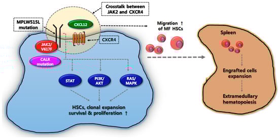 - Zhang, X.F.; Wang, J.F.; Matczak, E.; Proper, J.A.; Groopman, J.E. Janus kinase 2 is involved in stromal cell-derived factor-1alpha-induced tyrosine phosphorylation of focal adhesion proteins and migration of hematopoietic progenitor cells. Blood 2001, 97, 3342–3348. [Google Scholar] [CrossRef] [PubMed]