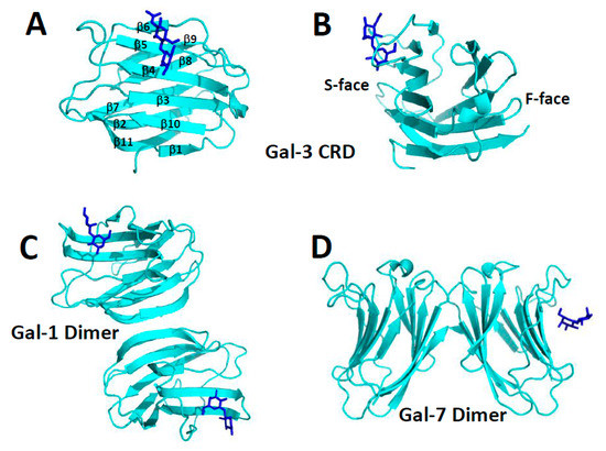 All three types of galectins (prototype, chimera, and tandem repeat) have a well-defined CRD with a highly conserved amino acid sequence and β-sandwich structure [8]. The CRD β-sandwich structure is composed of eleven β-strands (β1 to β11) running in antiparallel fashion, with six of them (β1, β10, β3, β4, β5, β6) defining the sugar binding face (S-face) of the CRD and the remaining five (β11, β2, β7, β8, β9) defining the opposing F-face, as illustrated with the Gal-3 CRD in Figure 1A,B. High resolution structures of the CRDs of many galectins (usually bound to lactose or N-acetyl-lactosamine) have been reported: e.g., human galectin-1 (Gal-1, [9]), galectin-2 (Gal-2, [10]), CRD of Gal-3 [11,12], C-terminal CRD of galectin-4 (Gal-4, [13]), galectin-7 (Gal-7, [14]), galectin-10 (Gal-10, [15,16,17]), bovine Gal-1 [18,19], mouse galectin-9 (Gal-9, [20]), toad ovary galectin [21,22], chicken galectin-16 (Gal-16, [23], galectins from conger eel: congerin I [24] and congerin II [25,26], fungal galectins from Coprinopsis cinerea [27] and Agrocybe cylindracea [28].