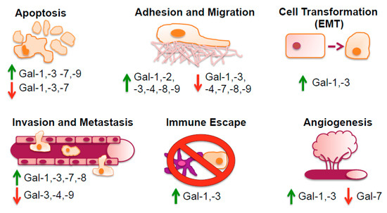 Galectins are involved in multiple processes of cancer initiation and development. A diversity of galectins is associated with key aspects of carcinogenesis, including apoptosis, adhesion and migration, cell transformation (EMT), invasion and metastasis, immune escape, and angiogenesis. Their tentative roles can be pro- and/or anti-tumorigenic, as indicated by green arrows up and red arrows down, respectively.