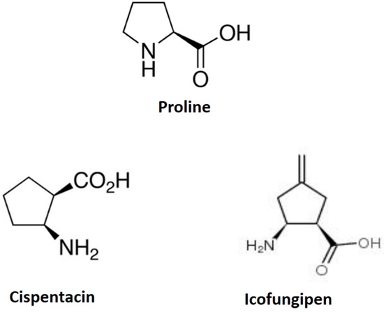 Beta-amino acids, including icofungipen, have been identified as potential new antifungal compounds to treat yeast infections, such as candidiasis [19]. Icofungipen, formerly known as PLD-118 (which was formerly known as BAY 10-8888), was isolated from the culture broth of a strain of Bacillus cereus, and is water-soluble and amphoteric (Figure 1) [20,21]. The mode of action is due to an active transport of the molecule via proline and other amino acid permeases into fungal cells, where it inhibits the isoleucyl-tRNA synthase and protein synthesis [22,23,24,25].