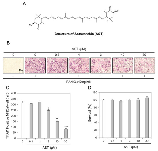 Astaxanthin suppresses osteoclastogenesis. (A) Chemical structure of Astaxanthin; (B) BMMs prepared from bone marrow cells were cultured for 4 days with RANKL (10 ng/mL) and M-CSF (30 ng/mL) in the presence of the indicated concentrations of Astaxanthin or 0.1% DMSO (control vehicle). The cells were fixed in 3.7% formalin, permeabilized in 0.1% Triton X-100, and stained for TRAP, a marker enzyme of osteoclasts; (C) TRAP-positive multinuclear cells (nuclei ≥ 3) were counted as osteoclasts. * p <0.05, ** p < 0.01, *** p <0.001; (D) The effect of Astaxanthin on the viability of BMMs was evaluated by CCK-8 assay. In (C, D), n = 3.