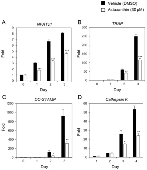 Astaxanthin inhibits the expression of the genes involved in osteoclastogenesis. BMMs were treated with 0.1% DMSO or Astaxanthin (30 μM) and then stimulated with RANKL (10 ng/mL) and M-CSF (30 ng/ml) for the indicated number of days. The expressed mRNA levels of (A) NFATc1, (B) TRAP, (C) DC-STAMP, and (D) cathepsin K were analyzed by real-time PCR compared with the DMSO control. * p <0.05, ** p <0.01, *** p <0.001 (n = 3).