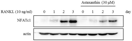 Bone marrow cells (BMCs) were isolated from the femur and tibia of 5-week-old male ICR mice (n = 2: Damool Science, Daejeon, Korea) by flushing with α-minimum essential medium (α-MEM; Invitrogen Life Technologies, Carlsbad, CA, USA) containing 100 units/mL penicillin and 100 µg/mL streptomycin (Invitrogen, Carlsbad, CA, USA). The BMCs were cultured with M-CSF (10 ng/mL) for 1 day, and the nonadherent cells were cultured for a further 3 days in the presence of M-CSF (30 ng/mL). Bone marrow macrophages (BMMs) were obtained from BMCs cultured on a petri dish in α-MEM supplemented with 10% fetal bovine serum (FBS; Invitrogen Life Technologies, CA, USA) with 30 ng/mL of mouse recombinant macrophage colony-stimulating factor (M-CSF; PEPROTECH, Rocky Hill, NJ, USA) for 3 days. The BMMs were seeded and cultured in the presence of 10 ng/mL of mouse recombinant receptor activator of nuclear factor-κB ligand (RANKL; R&D Systems, Minneapolis, MN, USA) and 30 ng/mL of M-CSF for 4 days in the presence or absence of astaxanthin.