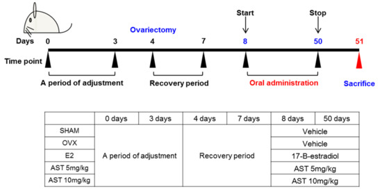 C3H/HeN female mice (eight weeks of age, weight 21 ± 1 g) were obtained from Orientbio (Orientbio Inc., Iksan, Korea). The mice were housed in standard polycarbonate cages under controlled conditions at 22 ± 2 °C in 50 ± 5% humidity under a 12-h light/dark cycle. The commercial rodent chow (DAE-HAN Biolink, Daejeon, Korea) and water were provided during the experimental period (6 weeks). Prior to the experiments, the mice were allowed to adapt to the laboratory environment for 3 days. The animals were anesthetized using Zoletil and Rumpun induced anesthesia prior to undergoing surgery. Sham operations were performed by exteriorizing the ovaries, and bilateral OVX procedures were performed using the dorsal approach. The animals were allowed to recover from surgery for 3 days prior to the experiments. After surgery, the mice were divided into two groups; the sham group (n = 5) and ovariectomized (OVX, n = 25) group. The OVX mice were then randomly divided into four groups; the OVX group (n = 5), OVX with estradiol group (E2, n = 5, 0.03 μg/head/day), OVX with AST 5 group (n = 5, given 5 mg/kg/day) and AST 10 group (n = 5, given 10 mg/kg/day). E2 treatment was used as a positive control to compare the effect of AST on osteoporosis. The vehicle, E2, and AST were administered for 6 weeks, and the body weights were recorded weekly. After administration of the vehicle, E2, and AST, blood and various tissues from the sacrificed animals were collected for biochemical and morphological analysis. Sera were collected and stored at −80 °C until use, and the uteruses, tibias and femurs were removed and weighed. All mice were treated in strict accordance with the Sunchon National University Institutional Animal Care and Use Committee’s (SCNU IACUC) guidelines for the care and use of laboratory animals. All procedures were approved by the SCNU IACUC (permit number: SCNUIACUC-2017-06, approval’s date: 22 May 2017).