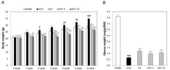 Effect of AST on body weight and uterus weight. The (A) body weight and (B) uterus weight measured at 24 h after the last treatment. Each value represents the mean ± SD for n = 5. # p < 0.05, ## p < 0.01, and ### p < 0.001 SHAM group vs. OVX group. * p < 0.05, ** p < 0.01, and *** p < 0.001 OVX group vs. E2, AST 5, and AST 10 group.