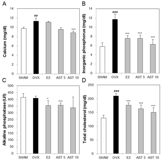 To evaluate the effect of AST administration on the biochemical markers in the osteoporotic mice, we measured the levels of calcium (Ca), inorganic phosphorus (IP), alkaline phosphatase (ALP), and total cholesterol (TCHO) in the serum. The Ca level of the OVX group was increased compared to that of the SHAM group. The increased Ca level in the OVX group was reduced by the oral administration of 10 mg/kg of AST (Figure 6A). Furthermore, the levels in the IP and TCHO groups were enhanced compared with those of the SHAM group. The exposure of the OVX mice to 5 mg/kg and 10 mg/kg of AST suppressed the enhancement of the levels in the IP and TCHO groups compared with those of the OVX group (Figure 6B,D). There was no difference in the ALP level between the SHAM and OVX groups. However, the administration of AST decreased the level of ALP (Figure 6C). These results indicate that the oral administration of AST reduces the enhancement of the biochemical parameters.