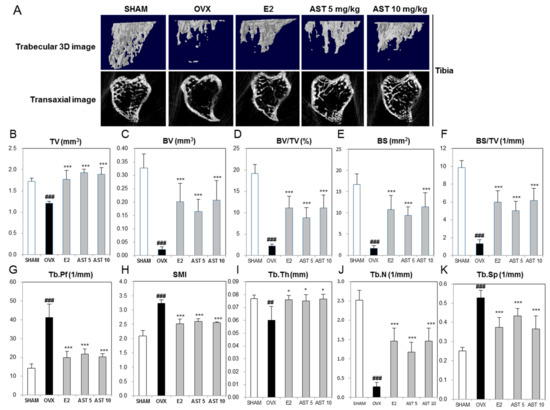 Osteoporosis is defined as the impairment of bone architecture. As new products and methods have been developed for therapy, effective and sensitive non-invasive means able to detect early changes in the bone fragility process have also been developed. Knowledge of the bone microarchitecture provides a clue to improving its diagnosis and treatment. The parameters of the bone microarchitecture were assessed via high-resolution computed tomography (CT), micro CT, high-resolution magnetic resonance (MR) and micro MR [51]. Bone histomorphometry is performed to obtain quantitative information on bone remodeling and structure. These parameters provide information about bone mass, are calculated from measurements of the total bone area and are related to the bone strength [52]. Histomorphometric parameters include bone volume/tissue volume (BV/TV), trabecular thickness (Tb.Th), trabecular number (Tb.N), trabecular separation (Tb.Sp), structure model index (SMI), and trabecular pattern factor (Tb.Pf) [53,54]. Previous studies showed that BV/TV, Tb.Th, and Tb.N were decreased and Tb.Sp, SMI, and Tb.Pf were increased in OVX mice [55,56]. In this study, we showed that the oral administration of AST increased the TV, BV, BV/TV, BS, BS/TV, Tb.Th, and Tb.N and decreased the Tb.Pf, SMI, and Tb.Sp in the tibia and femur. Also, this study evaluated the effects of AST on the histological status of the femoral bone via hematoxylin and eosin (HE) and TRAP staining. We demonstrated that the oral administration of AST in OVX mice inhibits the trabecular bone loss by suppressing the increase in the osteoclast activity. These results indicate that the exposure of OVX mice to AST suppresses the destruction of the bone architecture.