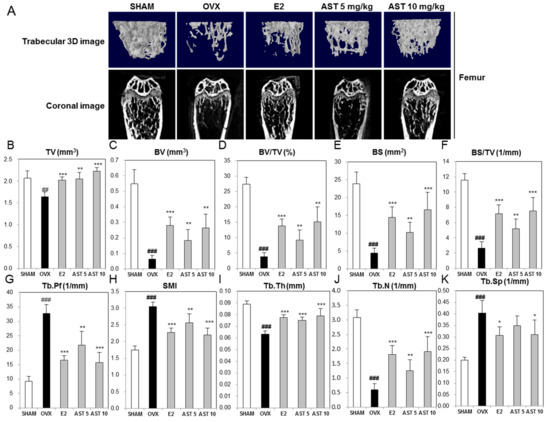 To determine the effect of AST on the morphological changes of the tibia and femur in the OVX mice, we analyzed the micro-architecture in the trabecular bone by micro-computed tomography (micro-CT). The trabecular bone of the proximal tibia in the OVX group was decreased compared to that of the SHAM group. However, the exposure to AST increased the trabecular bone (Figure 8A). When compared with the SHAM group, the tissue volume (TV), bone volume (BV), BV/TV, bone surface (BS), BS/TV, trabecular thickness (Tb.Th), and trabecular number (Tb.N) of the OVX group were significantly decreased. The oral administration of AST (5 and 10 mg/kg/days, p.o.) enhanced the TV, BV, BV/TV, BS, BS/TV, Tb.Th, and Tb.N (Figure 8B–J). The trabecular pattern factor (Tb.Pf), structure model index (SMI), and trabecular bone separation (Tb.Sp) of the OVX group were increased compared with those of the SHAM group. The treatment with AST reduced the Tb.Pf, SMI, and Tb.Sp (Figure 8G,H,K). Similar to the microstructure of the proximal tibia, the oral administration of AST increased the trabecular bone in femur, TV, BV, BV/TV, BS, Tb.Th, and Tb.N, and decreased the Tb.Pf, SMI, and Tb.Sp (Figure 9). The analysis of the properties of the trabecular bone indicated that AST induces damage to the trabecular bone micro-architecture in OVX mice.