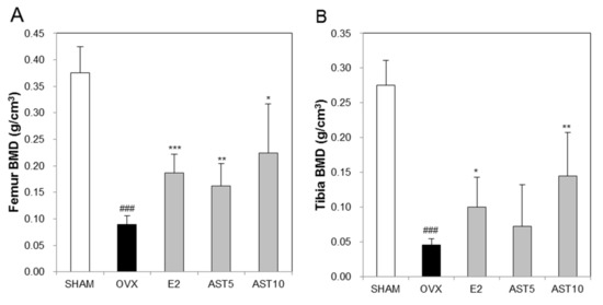 In order to confirm the inhibitory effect of AST on the bone loss in the OVX mice, we quantified the trabecular bone mineral density (BMD) in the femur and tibia. The BMD of the OVX group was significantly reduced compared to that of the SHAM group. However, the oral administration of AST significantly suppressed the reduction of the BMD in the femur (Figure 10A) and tibia (Figure 10B). These results indicate that AST has an inhibitory effect on the cancellous bone loss.