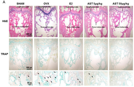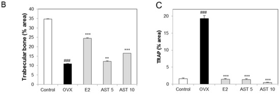 The digital femur of the mice in all of the groups underwent H&E staining to facilitate the observation of histological changes (Figure 11A). The trabecular bone of the OVX group was decreased compared with that of the SHAM group. However, the trabecular bone area in the AST oral administration group (AST 5 and 10 mg/kg) was enhanced compared to that of the OVX group (Figure 11B). The TRAP positive cells numbers of the OVX group were increased compared to those of the SHAM group. The treatment of the OVX mice with AST suppressed the TRAP activity (Figure 11C). These results suggest that AST has inhibitory effects on the TRAP activity.
