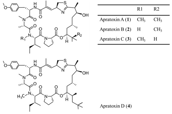 - Ma, D.; Zou, B.; Cai, G.; Hu, X.; Liu, J.O. Total synthesis of the cyclodepsipeptide apratoxin a and its analogues and assessment of their biological activities. Chemistry 2006, 12, 7615–7626. [Google Scholar] [CrossRef] [PubMed]