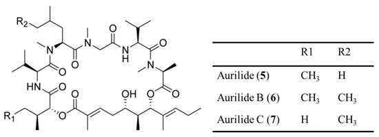 | Aurilide (5), B (6), C (7) | Cyanobacteria: Lyngbya majuscula | Cyclic depsipeptide | Cytotoxicity /in vitro only | LC50: 40–130 nM (NCI-H460), 10–50 nM (neuro-2a), GI50 < 10 nM (NCI 60 cell line panel) | [36,37] |