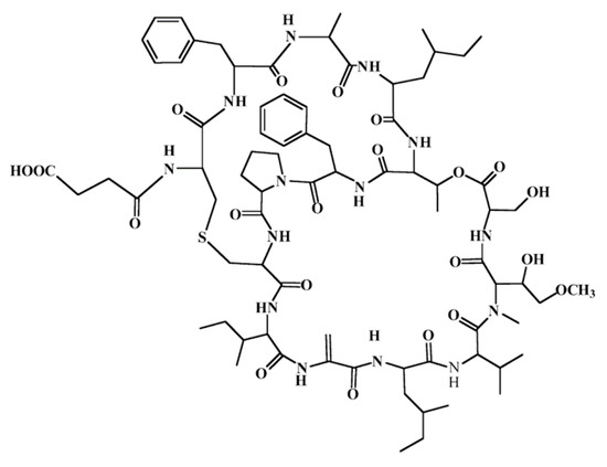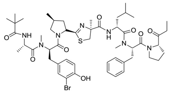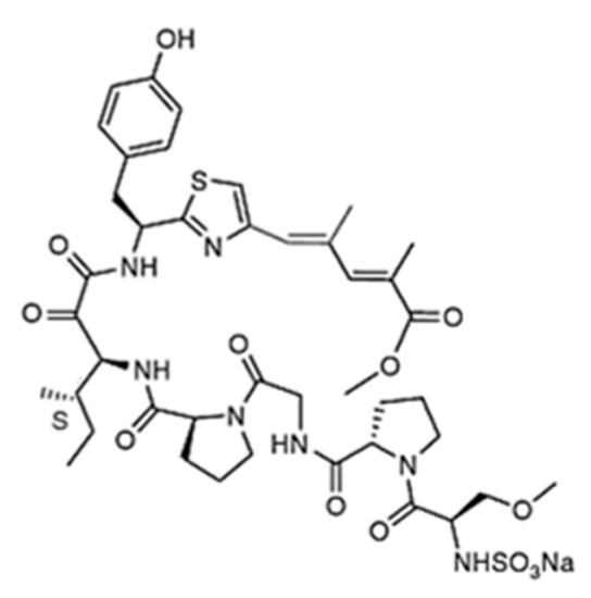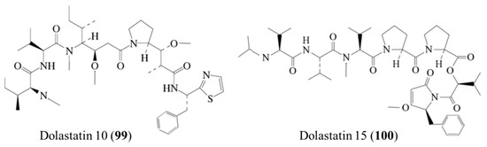 | Dolastatin 10 (99), 15 (100) | Mollusk: Dolabella auricularia | Linear peptide | Microtubule assembly inhibition and Bcl-2 phosphorylation /Human clinical trial Dolastatin 10: phase II (TZT-1027: Phase III) Dolastatin 15: preclinical (ILX651: Phase II, LU-103793: Phase I) | IC50: 50–5000 pM (CA46), 0.5–3 nM (L1210) | [135,136,137,138,139,140,141] |