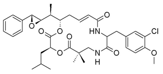 | Cryptophycin (10) | Cyanobacteria: Nostoc sp. | Depsipeptide | Apoptosis and microtubule inhibition /in vitro only (Cryptophycin-52: Phase II human clinical trial) | IC50 < 50 pM (MDR tumor cell lines), | [40,41,42,43,44] |
