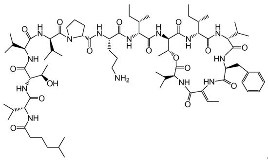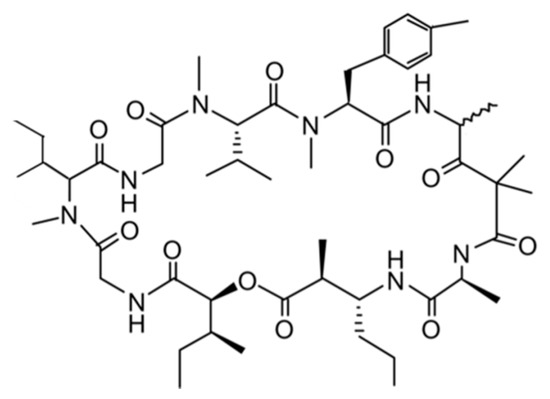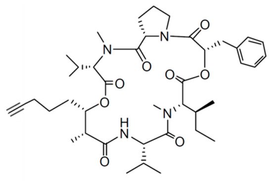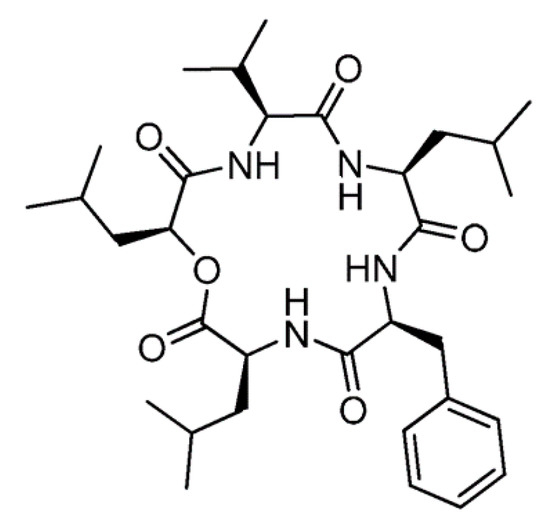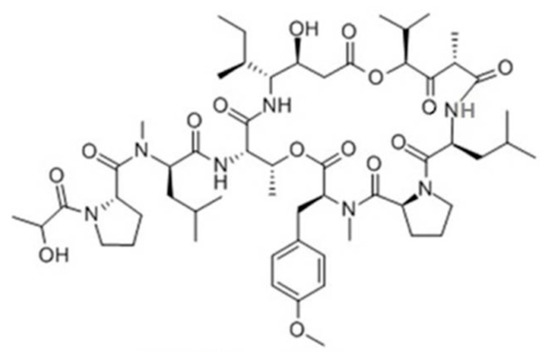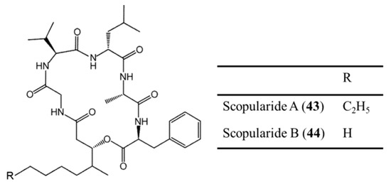 | Scopularides A (43), B (44) | Fungus: Scopulariopsis brevicaulis | Cyclic depsipeptide | Cytotoxicity /in vitro only | IC50: 10 μg/mL (Colo357, Panc89, HT29) | [77] |