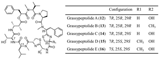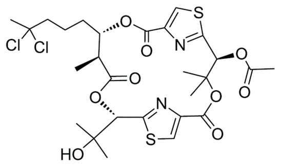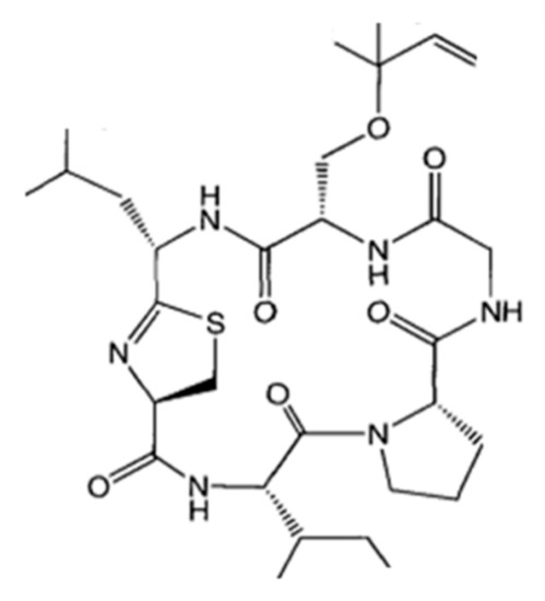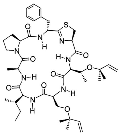 - Wipf, P.; Miller, C.; Venkatraman, S.; Fritch, P. Thiolysis of oxazolines-A new, selective method for the direct conversion of peptide oxazolines into thiazolines. Tetrahedron Lett. 1995, 36, 6395–6398. [Google Scholar] [CrossRef]
