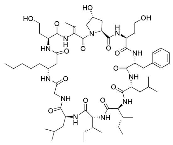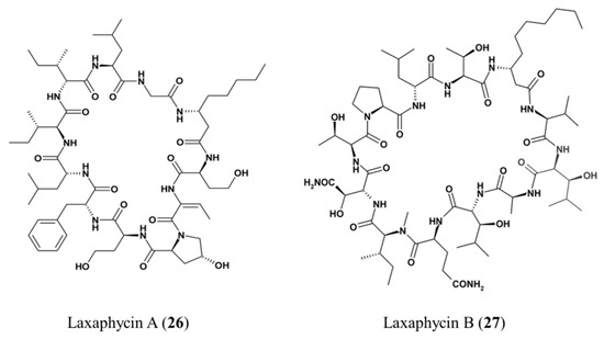 | Laxaphycin A (26), B (27) | Cyanobacteria: Lyngbya majuscula | Cyclic peptide | Antiproliferative activities/in vitro only | IC50 < 2 μM (CEM-WT) | [61,62,63] |