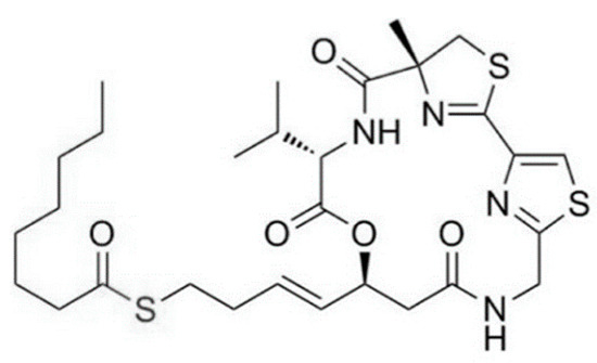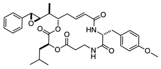 | Largazole (25) | Cyanobacteria: Symploca sp. | Cyclic depsipeptide | Stimulation of histone hyperacetylation in the tumor/in vitro only | GI50: 7.7 nM (MDA-MB-231), 122 nM (NMuMG), 55 nM (U2OS), 480 nM (NIH3T3) | [56,57,58,59,60] |