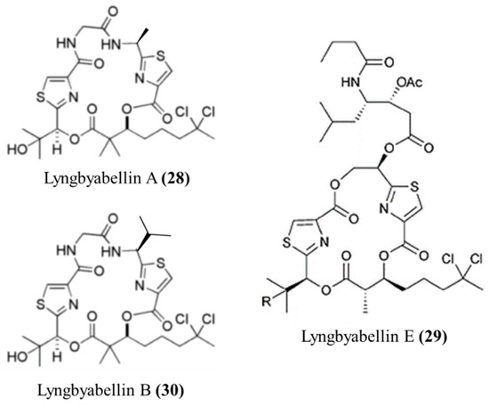 | Lyngbyabellin A (28), E (29), B (30) | Cyanobacteria: Lyngbya majuscula | Lipopeptides | Cytoskeletal actin disruption/in vitro only | IC50: 0.03–0.1 μg/mL (KB), IC50: 0.5–0.83 μg/mL (LoVo), LC50: 0.4–1.2 μg/mL (NCI-H460, neuro-2a) | [64,65] |