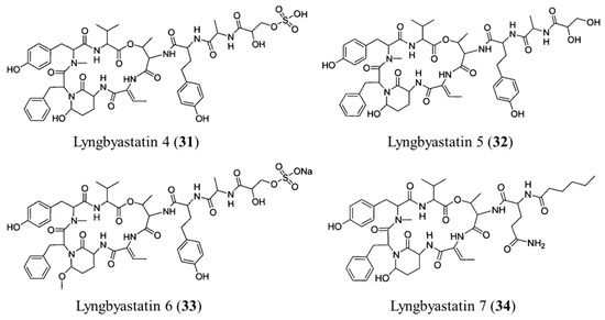 | Lyngbyastatin 4–7 (31–34) | Cyanobacteria: Lyngbya sp. | Depsipeptide | Porcine pancreatic elastase inhibition /in vitro only | IC50: 120–210 μM (elastase inhibition) | [66,67] |