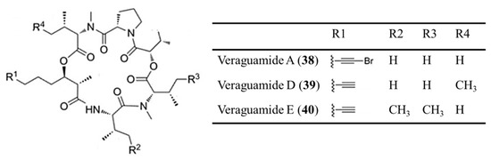 | Veraguamide A (38), D (39), E (40) | Cyanobacteria: Oscillatoria margaritifera, Symploca cf. Hydnoides sp. | Cyclic depsipeptide | Cytotoxicity /in vitro only | LC50: 141 nM (H-460), IC50: 0.5–1.5 μM (HT29, HeLa) | [72,73] |