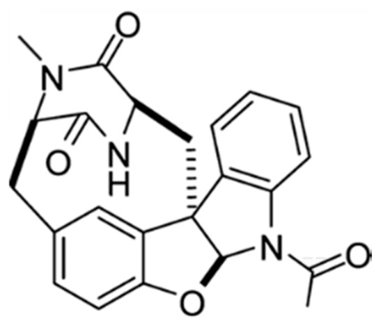 | Azonazine (41) | Fungus: Aspergillus insulicola | Hexacyclic dipeptide | Cytotoxicity /in vitro only | IC50 < 15 ng/mL (HCT-116) | [74] |