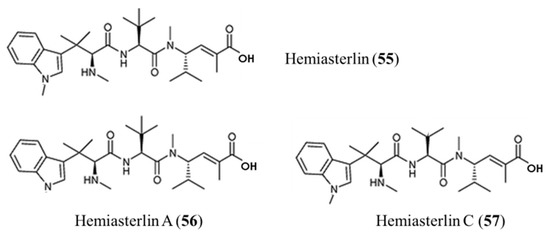 | Hemiasterlin (55), A (56), C (57) | Sponge: Auletta sp., Siphonochalina sp. | Linear tripeptide | Inhibition of tubulin polymerization /Phase I human clinical trial, (HT1286: Phase I) | IC50: 0.0484–0.269 nM (PC3), 0.404–10.3 nM (NFF), | [88,89,90,91,92,93,94,95] |