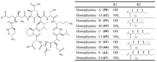 | Homophymine A–E (58–62), A1–E1 (63–67) | Sponge: Homophymia sp. | Cyclic depsipeptide | Activation of caspase-3 and 7/in vitro only | IC50: 2–100 nM (MCF7/MCF7R, HCT116/HCT15, HL60/HL60R) | [96] |