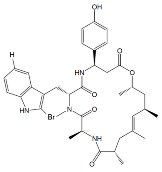 | Kahalalide F (101) | Mollusk: Elysia rufescens | Depsipeptide | ErbB3 protein and PI3K-Akt pathway involved in necrosis induction, apoptosis /Phase I human clinical trial (Elisidepsin: phase II) | IC50: 0.162–0.288 μM (colon), 0.135 μM (A549), 0.162 μM (H5578T), 0.479 μM (HS-578T) | [142,143,144,145,146,147,148,149,150,151,152,153,154,155] |