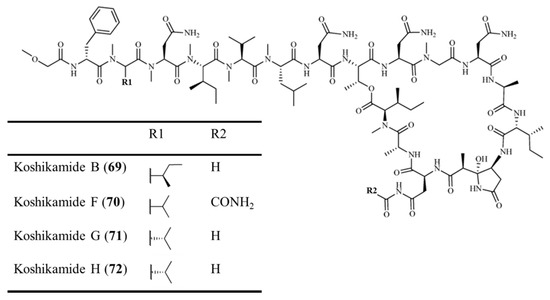 | Koshikamide B (69), F–H (70–72) | Sponge: Theonella sp. | Peptide lactone | Cytotoxicity /in vitro only | IC50: 0.45–2.3 μM (P388), 5.5–10 μM (HCT-116) | [100,101] |