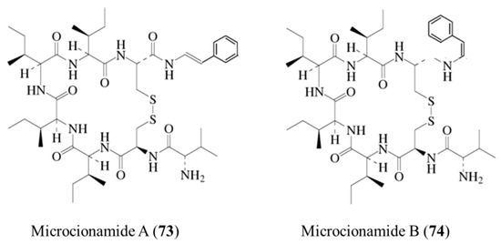 | Microcionamide A (73), B (74) | Sponge: Clathria (Thalysias) abietina | Cyclic heptapeptide | Cytotoxicity /in vitro only | IC50: 125–177 nM (MCF-7), 98–172 μM (SKBR-3) | [102] |