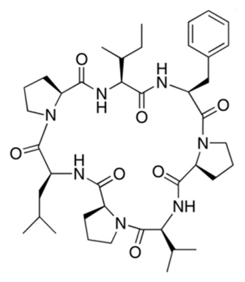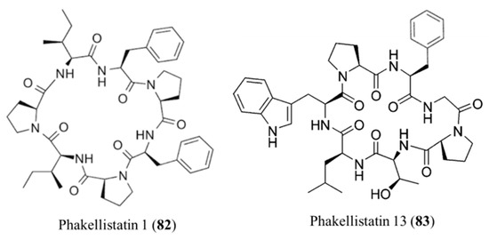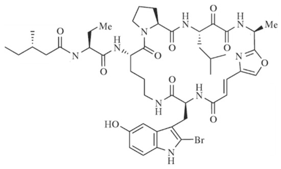 | Phakellistatin 1 (82), 13 (83) | Sponge: Phakellia carteri | Cyclic heptapeptides | Antiproliferative activity/in vitro only | ED50: 7.5 ug/mL (P388), IC50: 0.75 ng/mL (BEL-7404) | [106,107,108] |