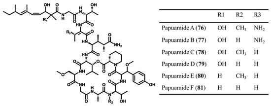 | Papuamide A–F (76–81) | Sponge: Theonella mirabilis, T. swinhoei | Cyclic depsipeptide | Cytotoxicity and inhibition of infection /in vitro only | IC50: 0.75 ng/mL (human cell line panel) | [83,104,105] |