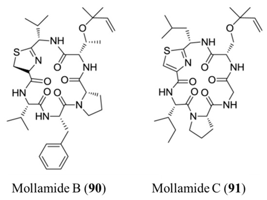 | Mollamide B (90), C (91) | Ascidia: Didemnum molle | Cyclic depsipeptide | Antiproliferative activity/in vitro only | IC50: 1 μg/mL (P388), 1 μg/mL (A549, HT29) | [128,129,130] |