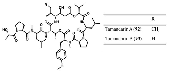 | Tamandarin A (92), B (93) | Ascidia: Didemnum sp. | Cyclic depsipeptide | Cytotoxicity /in vitro only | IC50: 1.79 μg/mL (BX-PC3), 1.36 μg/mL (DU145), 0.99 μg/mL (UMSCC10b) | [131] |