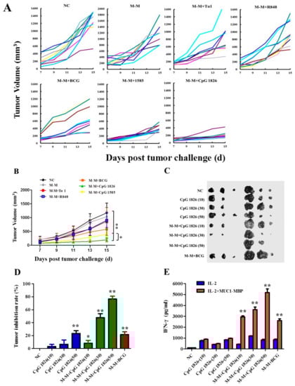 2.1. Combination of M-M and CpG 1826 Inhibited B16-MUC1 Growth in Mice