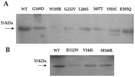 (A) Western blot of the human mHS protein (WT) and p.G169D, p.W185R, p.G232V, p.L266S, p.I407T, p.Y503C, p.R505Q previously reported and (B) p.R112W, p.V144L and p.M146R mutants.