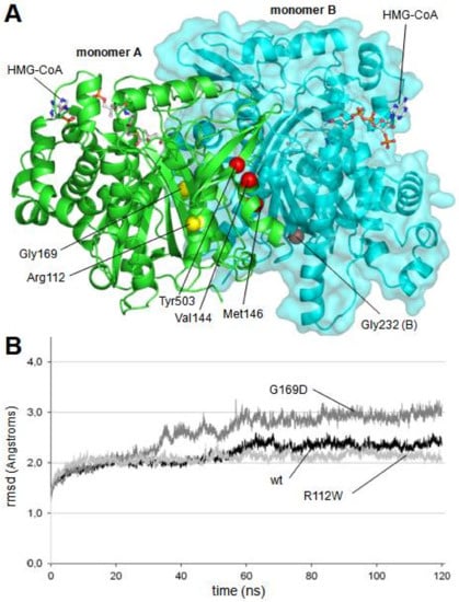 (A) Location of mutants in the dimer structure of human mitochondrial HMG-CoA synthase. Residues Val144, Met146, Gly232 and Tyr503, located in a cluster close to the dimerization surface, are colored in red. Mutated residues located away from the dimerization surface, Arg112 and Gly169, are colored in yellow. Location of two HMG-CoA molecules is indicated. (B) Root mean square deviation (rmsd) values measured over the unrestricted 120 ns of molecular dynamics trajectories of the wild type and the mutant mHS structures. For clarity purposes, only the trajectories defining the upper (p.G169D) and lower (p.R112W) limits, as well as the wild type trajectory, are depicted. Values of rmsd corresponding to all other trajectories (p.V144L, p.M146R, p.G232V and p.Y503C) are located between those limits.