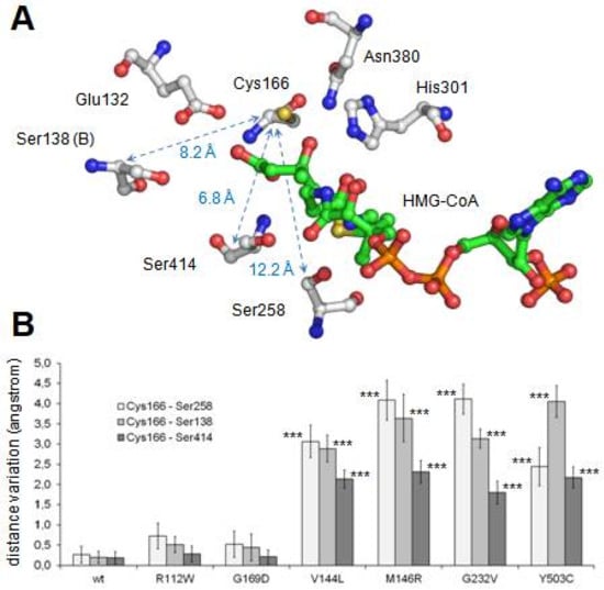 During the 120-ns-long simulation of all mutant structures, the maintenance of the correct shape of the active center cavity was monitored by the continuous measurement of the distances between the residues implicated in the enzymatic activity (Figure 3A). After comparison of all the obtained values (not shown), we found that the best descriptors of internal movements in the substrate cavity were the distances between the Cα of the catalytic residue Cys166 and the Cα of three serine residues located in the opposite wall of the substrate cavity (Figure 3A). In the case of the wild type protein, such distances remain constant along the entire molecular dynamics trajectory. To analyze the behavior of these three distances during the molecular dynamics trajectories of the mutants, individual values were collected every 20 ps along the last 20 ns of all trajectories (i.e., once the simulations have reached a stable stage). The difference between each value and the average value of the corresponding distance in the trajectory of the wild type protein was calculated. Mean and standard deviation of all measured differences are shown in Figure 3B. Student’s t-test was used to evaluate the statistical significance of the differences.