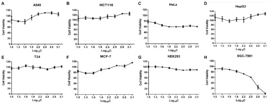 To assess the cytotoxicity of SPPH, we selected the above 7 cancer cells derived from different tumour tissues and HEK293 cell to analysis the cell viability after SPPH treatment. The cell viability assay was performed using the MTT method. Target cells, which were cultured to logarithmic growth phase, were seeded in 96-well plates with 6 × 103 cells/well. After culturing for 24 h, the SPPH of varied concentrations were added to wells, and the cells were processed for 24–48 h. After dropping the supernatant, 10% MTT solution was added to each well and incubated for 4 h. 150 μL DMSO was added to wells and oscillated with low speed for 10 min to dissolve the formazan crystals. The absorbance measurement was conducted at 490 nm by a BioTek microplate reader (Winooski, VT, USA). The ratio of cell viability was calculated as follows: