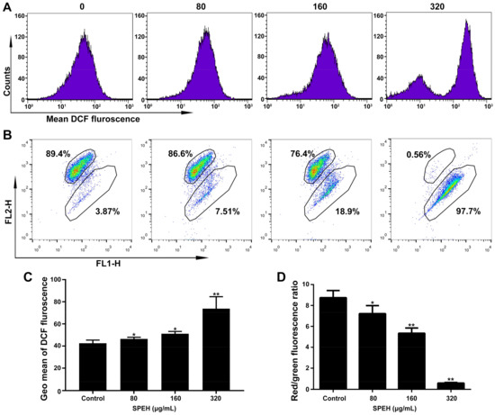 Depolarization of MMP is a factor that contributes to cell apoptosis and may be accompanied by excessive ROS generation [20,21]. Therefore, we evaluated the MMP change of SGC-7901 after SPPH treatment using JC-1 staining. As shown in Figure 4B, cells with normal MMP were significantly decreased after treatment with 80, 160 and 320 μg/mL SPPH (89.4% to 86.6%, 76.4% and 0.56%, respectively). Moreover, relative quantification of MMP by Geo Means indicated that the red fluorescence was reduced, and the green fluorescence was remarkably increased after SPPH treatment (Figure 4D), indicating that MMP was disrupted after SPPH treatment.