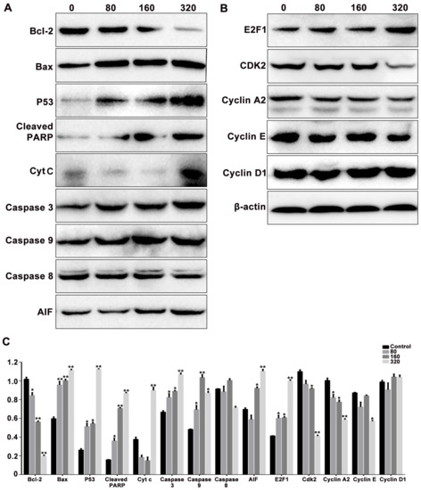 For western blotting analysis, the primary antibodies against AIF, BCL-2 and Bax were purchased from HUABIO Biotechnology (Hangzhou, China). The primary antibodies against CDK2, Caspase-3, Caspase-9, Cyt C, E2F1, Cleaved-PARP, P53, E2F1, CDK2, cyclin A2, cyclin D1 and cyclin E were purchased from Cell Signaling Technology (Beverly, MA, USA). Horseradish peroxidase (HRP)-conjugated secondary antibody was purchased from Abcam (Cambridge, MA, USA). One-Step Animal Cell Active Protein Extraction Kit was purchased from Sangon Biotech (Shanghai, China). BCA Protein Assay Kit was purchased from Pierce (Rockford, IL, USA). Immobilon Western Chemiluminescent HRP Substrate was purchased from Millipore (Atlanta, GA, USA). Materials and chemicals for electrophoresis were from Bio-Rad (Hercules, CA, USA).
